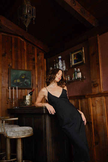 Midi-length backless slip dress featuring spaghetti straps and plunging v-neckline.