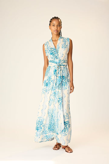 Sleeveless maxi dress with double snap closure across elastic waist.